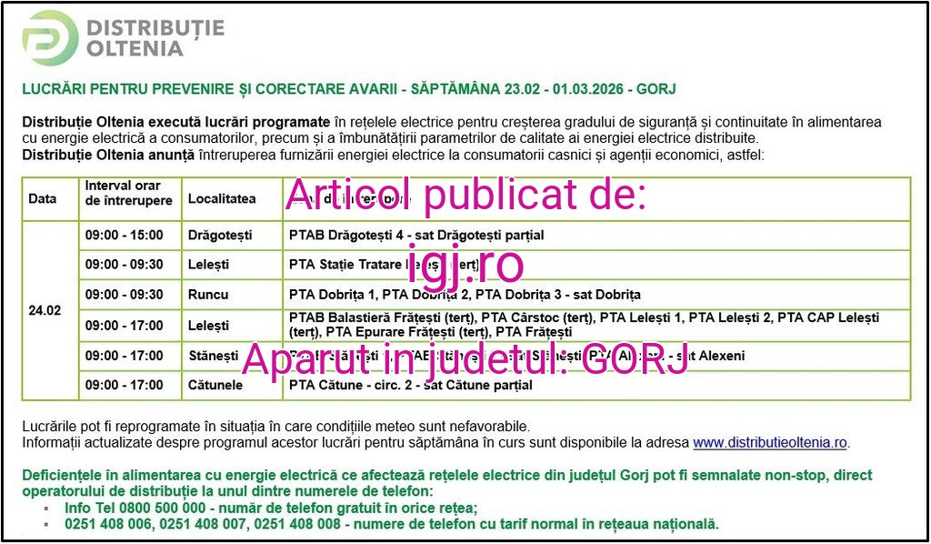 Distribuţie Oltenia anunţă programul de întrerupere a furnizării energiei electrice din data de 24.02.2026 – Impact in igj.ro 17 februarie 2026 Acțiune FacebookTwitterPinterestWhatsApp Distribuţie Oltenia anunţă programul de întrerupere a furnizării energiei electrice din data de 24.02.2026. Sursa: https://igj.ro/intreruperi-in-alimentarea-cu-energie-electrica/distributie-oltenia-anunta-programul-de-intrerupere-a-furnizarii-energiei-electrice-din-data-de-24-02-2026.html Acțiune FacebookTwitterPinterestWhatsApp Ultimă oră asingorj.ro Patroana unui cunoscut restaurant, săltată de polițiști Robo Stiri - 17 februarie 2026 gorjonline.ro BNR menține dobânda cheie la 6,50% pe an – GorjOnline – Zi de zi informați! Robo Stiri - 17 februarie 2026 pandurul.ro Fost jucător al Universității Craiova, anchetat pentru fals în acte! Robo Stiri - 17 februarie 2026 tele3.ro Jandarmii gorjeni, mobilizați pentru siguranța spectatorilor la competițiile sportive din județ – TELE3MEDIA Robo Stiri - 17 februarie 2026 Același autor igj.ro Control judiciar dispus de PJ Târgu Jiu pentru agresorii doctoriței Obrocea – Impact in 17 februarie 2026 igj.ro Fostul director de la Colegiul Economic va da explicații în fața Colegiului de Disciplină al IȘJ Gorj – Impact in 17 februarie 2026 igj.ro Reținut pentru nerespectarea ordinului de protecție, la Turceni – Impact in 17 februarie 2026 igj.ro Și-a amenințat vecinul cu moartea – Impact in 17 februarie 2026