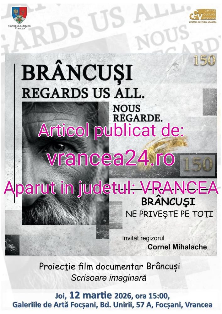 Consiliul Județean Vrancea, prin Centrul Cultural Vrancea, organizează joi, 12 martie 2026, ora 15.00, la Galeriile de Artă Focșani, un eveniment de prestigiu instituit pentru a marca 150 de ani de la nașterea marelui sculptor Constantin Brâncuși.