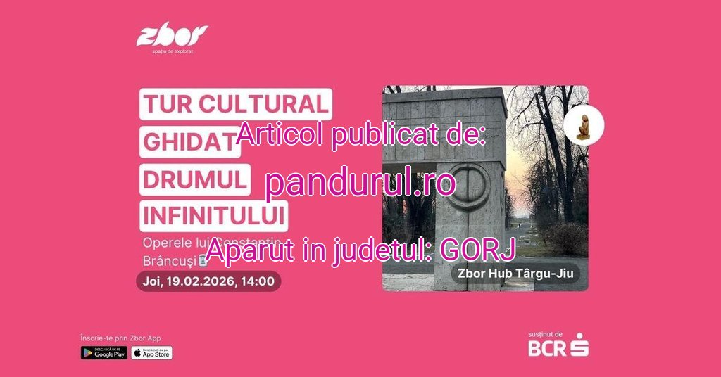 Un tur cultural ghidat dedicat tinerilor va avea loc pe 19 februarie 2026, de la ora 14:00, în municipiul Târgu Jiu, sub genericul „Drumul Infinitului”. Evenimentul este organizat de voluntari locali și își propune să ofere o perspectivă fresh asupra orașului și a celebrului ansamblu monumental realizat de Constantin Brâncuși.
